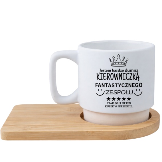 Wyjątkowa biała matowa filiżanka na bambusowej podstawce z dedykacją to idealny prezent.