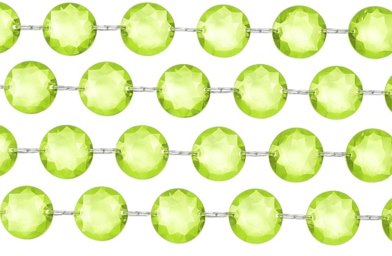 "Girlanda kryształowa w kolorze jasnozielonym, długość 1 metr. Średnica kryształowego kółka 18 milimetrów. Pakowanie: 1 sztuka. "