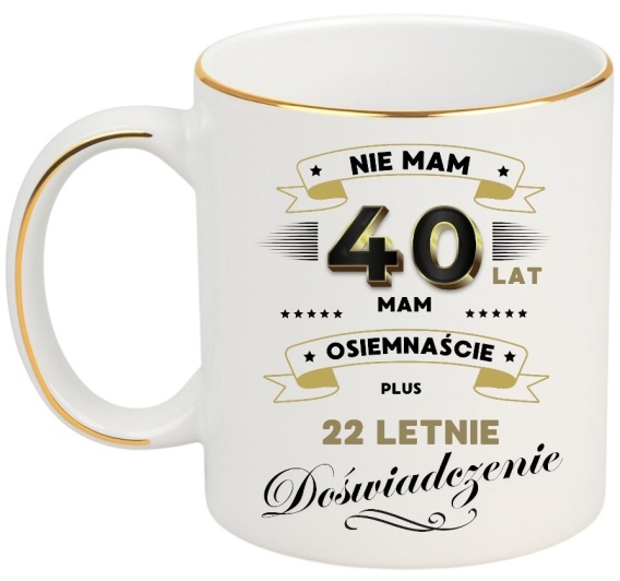 KUBEK PREMIUM NA 40 URODZINY BIAŁO-ZŁOTY ŚMIESZNY PREZENT