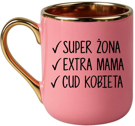 - Kolor kubka: różowy ze złotym uchem i rantem