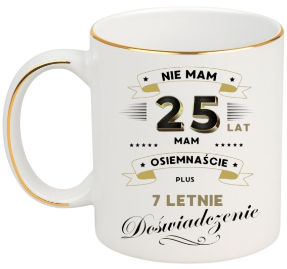 KUBEK PREMIUM NA 25 URODZINY BIAŁO-ZŁOTY ŚMIESZNY PREZENT