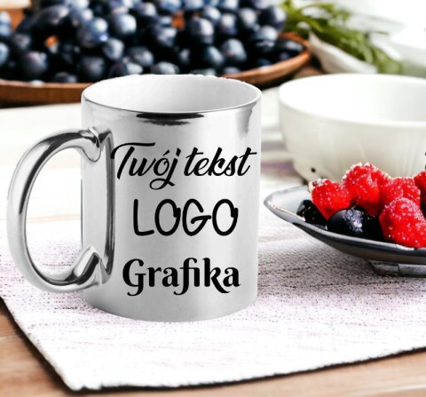 Kubek w kolorze srebrnym błyszczącym z czarnym nadrukiem