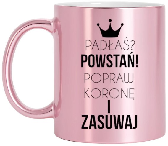 Kubek w kolorze różowym błyszczącym (metalik) z czarnym nadrukiem (nadruk z OBU STRON kubka)