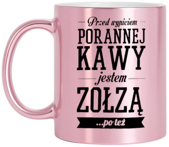 Kubek w kolorze różowym błyszczącym (metalik) z czarnym nadrukiem (nadruk z OBU STRON kubka)