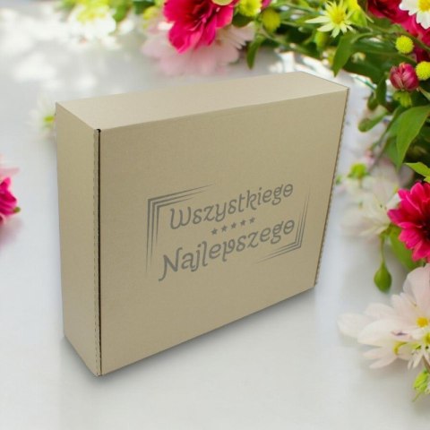 Całość jest zapakowana w karton z napisem Wszystkiego Najlepszego (karton jest w kolorze szarym a nie białym)