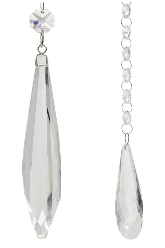 Zawieszki z przezroczystymi akrylowymi kryształkami połączonymi metalowymi kułeczkami dzięki którym możemy sobie skracać na dowolno wielkość, zakończone akrylowym przezroczystym soplem.